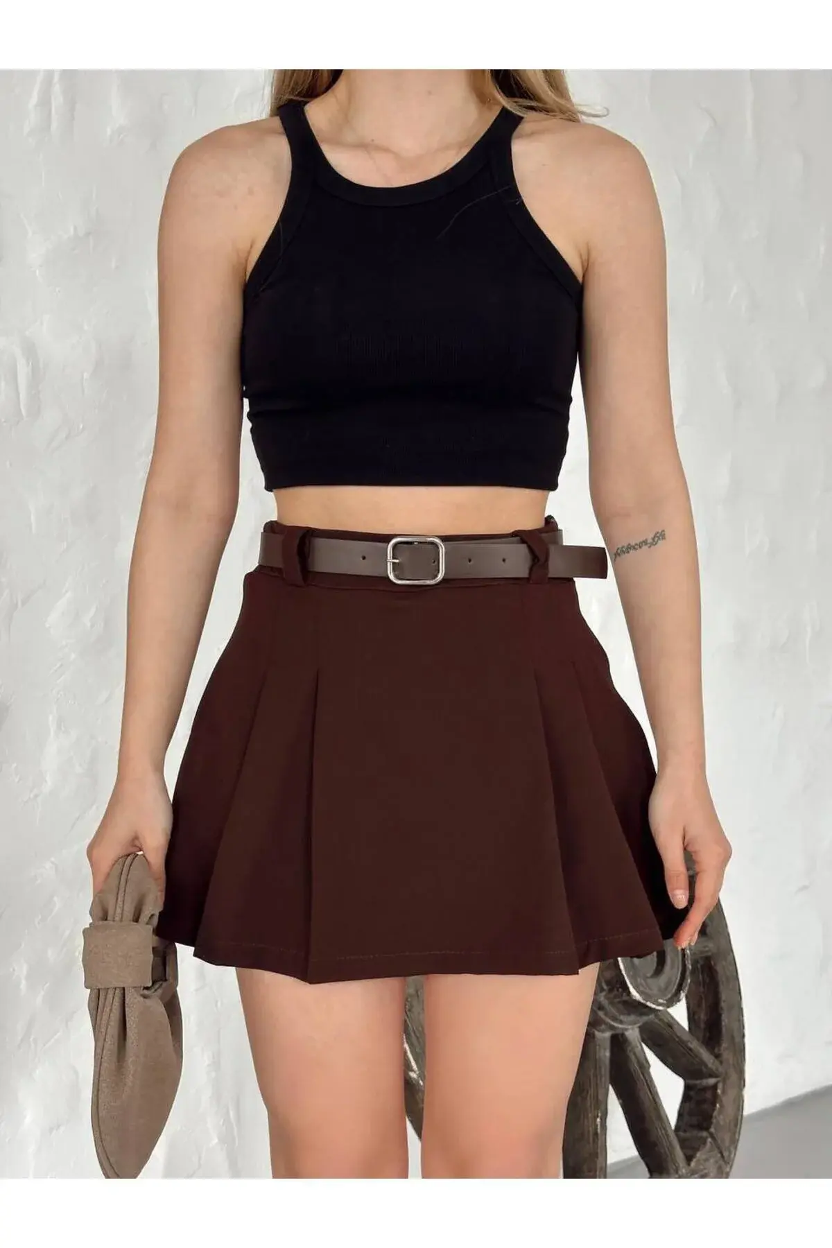 Kurzer Plissierter Shortsrock mit Gürtel für Damen. Ein kurzer Rock mit Quastendetails, der Eleganz und Komfort mit unserem Rock kombiniert.; - Ein Design, das zu allen Jahreszeiten getragen werden kann, passend für alle Jahreszeiten.; - Passt sich mit seiner taschenlosen Struktur für den praktischen Gebrauch leicht Ihren täglichen Kombinationen an.; - Kurzer Plissierter Shortsrock mit Gürtel für Damen. Mit der einfarbigen Option erhalten Sie einen zeitlosen Look.; - Bietet langfristigen Gebrauch, wenn Sie die Waschanleitung befolgen. Sie können ihn gemäß der Waschanleitung TYP1 pflegen.; - Ideal für eine breite Palette von Benutzern, die alle Altersgruppen ansprechen.; Kurzer Plissierter Shortsrock mit Gürtel für Damen. Dank seines mitteldicken Stoffes bietet er auch in den Übergangszeiten ein angenehmes Erlebnis.; - Er schafft eine dynamische und trendige Silhouette, die Ihren jugendlichen Geist anspricht.; - Er bietet mit seinem normal taillierten Schnitt Bewegungsfreiheit den ganzen Tag über.; - Sie können ihn dank seines blickdichten Materials auch für Ihre besonderen Momente wählen.; - Er passt sich perfekt Ihren Körperlinien an und präsentiert mit seinem schmalen Schnittmuster eine moderne und stilvolle Haltung.; - Es ist ideal für die Sommermonate und vermittelt durch seine ungefütterte Struktur ein Gefühl von Leichtigkeit.