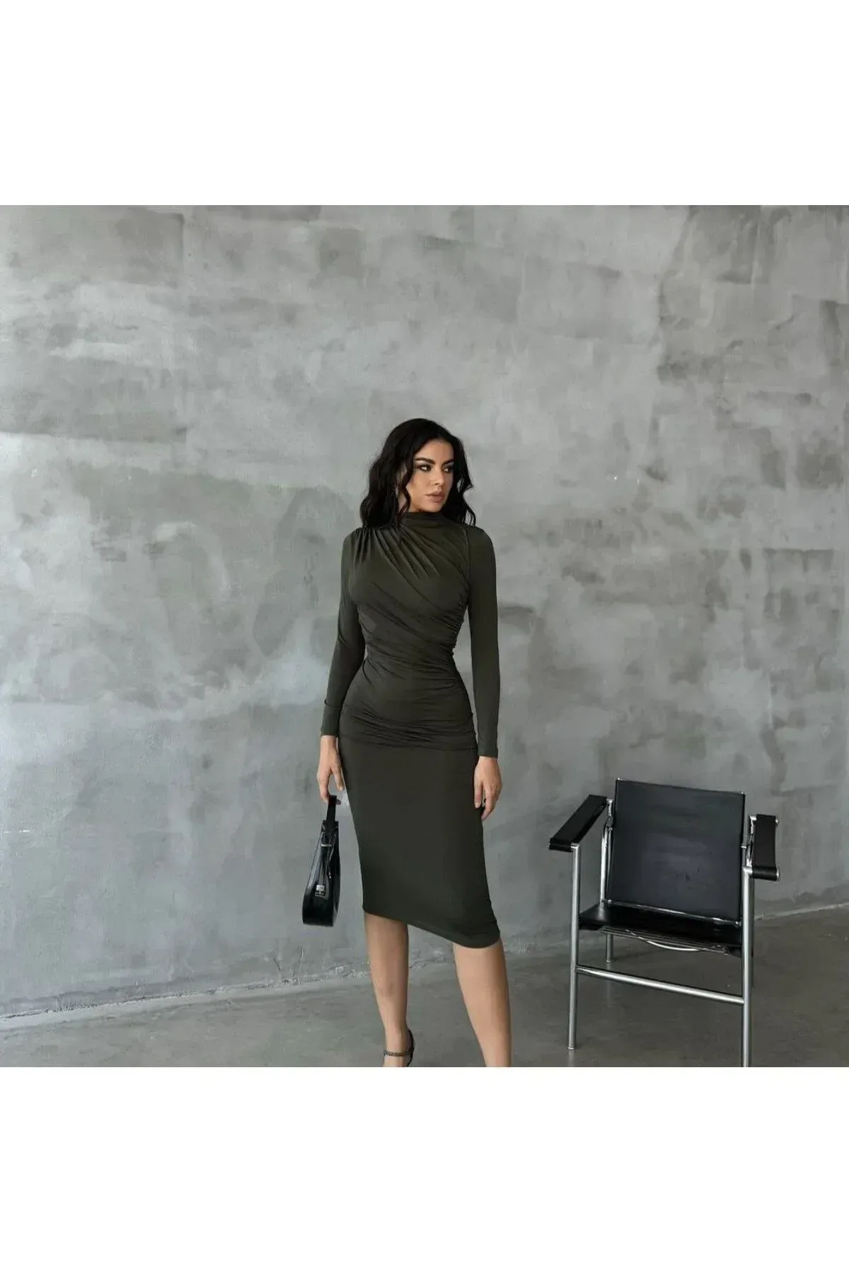 - Der Slim-Fit-Schnitt passt sich mit eleganten Raffdetails perfekt Ihrer Körperform an. - Das langärmlige Design bietet idealen Schutz in der Übergangszeit, ohne Kompromisse bei Ihrer Eleganz einzugehen. - Die Bleistift-Silhouette unterstreicht dank ihrer Länge Eleganz und Noblesse. - Es zieht mit seinem modernen und jugendlichen Stil die Blicke auf sich und spricht Erwachsene an. - Dank der Einzelverpackung ist es einfach zu tragen und praktisch beim Einkaufen. - Das unbedruckte Leopardenmuster sorgt für einen auffälligen und trendigen Look, während die taschenlose Struktur einen minimalistischen Stil bietet. - Die Sandy-Webart erhöht die Haltbarkeit und verspricht lange Tragekomfort. - Dieses Kleid mit seiner leichten, ungefütterten Struktur bietet ein angenehmes Tragegefühl. - Es betont die femininen Linien mit Raffdetails, während sich der mitteldicke Stoff den saisonalen Bedingungen anpasst. - Als Teil der jungen Kollektion entworfen, begleitet es Ihren energischen und dynamischen Stil. - Die leuchtenden Grüntöne sorgen für einen auffälligen Effekt, während das Leopardenmuster Ihre Besonderheit unterstreicht. - Dank der langen Ärmel können Sie es auch an kühlen Abenden problemlos tragen. - In Größe L entworfen, sodass es auch von Frauen mit Standardgröße bequem getragen werden kann. - Als Teil der Young-Kollektion wurde es sorgfältig hergestellt, um Ihren jugendlichen Geist anzusprechen. - Dank seines Polyester-Mischgewebes behält es seine Form und verspricht eine lange Nutzungsdauer.