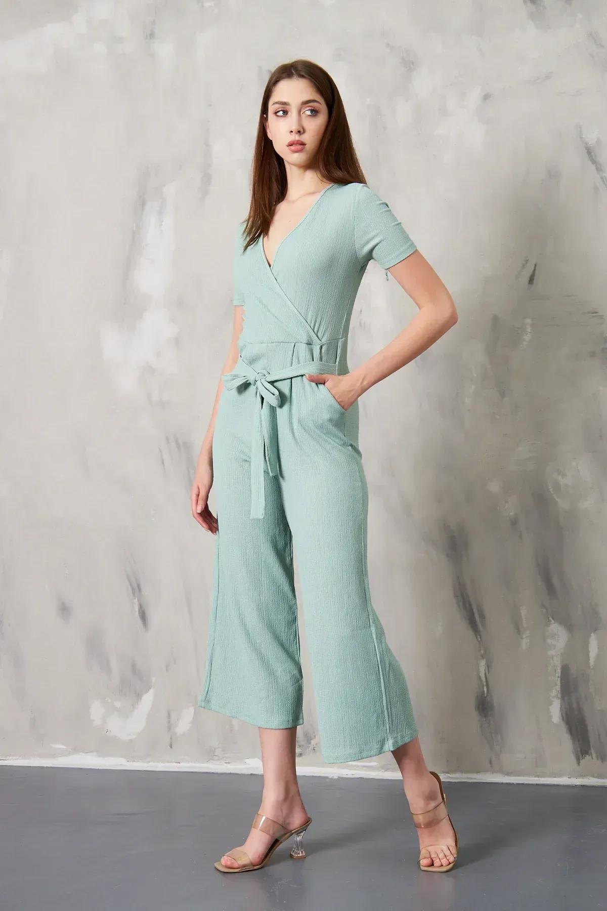 DOUBLE-BREASTED COLLAR BELTED CREAM FABRIC JUMPSUIT Mint Green - L