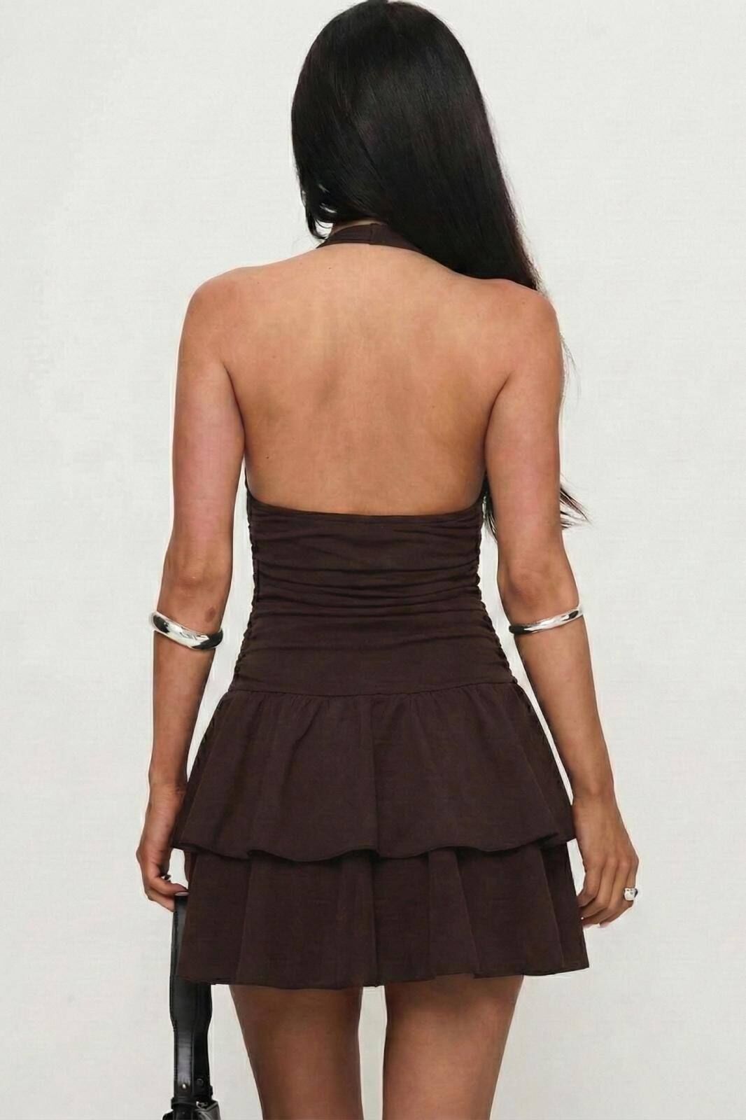 Kadın Halter Yaka Eteği Katlı Toparlayıcı Dalgıç Kumaş Party Mini Elbise DANCE