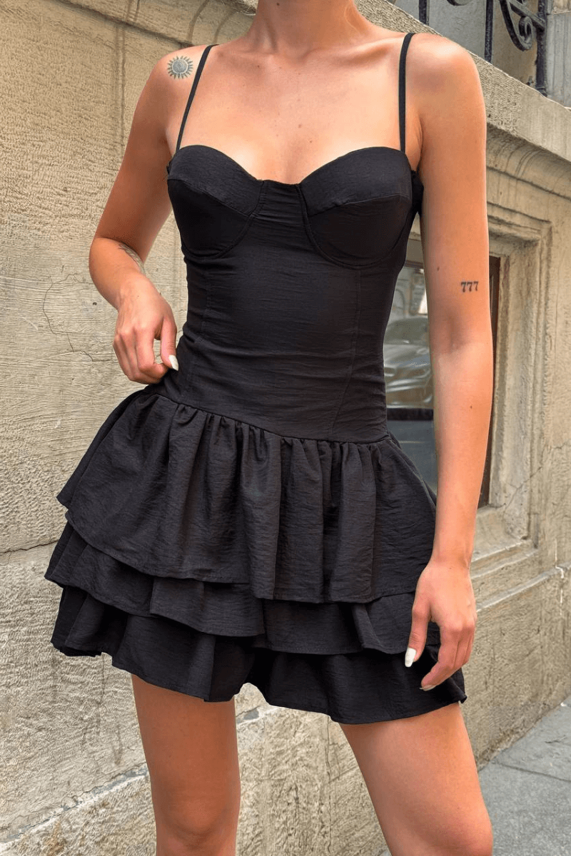 Şık gece etkinliklerinden özel davetlere kadar geniş kullanım alanına sahip olan bu Kadın Askılı Volanlı Sırt Bağcıklı Mini Elbise, modern ve seksi stilinizi ön plana çıkaracak zarif ve fonksiyonel bir parçadır.
