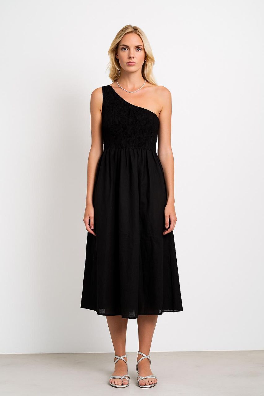 - Rahat kesimiyle günlük kullanım için ideal olan bu elbise, belden açılan gipe detaylarıyla feminen bir siluet sunar.; - Tek kollu tasarımıyla modern ve şık bir görünüm sağlar; yaz ayları için hafif ve konforlu bir seçenektir.; - Astarsız yapısı sayesinde hafif ve serin tutan dokusuyla dikkat çeker; beyazlatıcı kullanmadan ve kurutucuya ihtiyaç duymadan kolayca temizlenebilir.; - Skater kalıbıyla vücut hatlarını nazikçe sararak rahat hareket etme özgürlüğü tanır.; - Dokulu kumaşı, polyester karışımlı materyali ile dayanıklılık ve uzun ömürlülük vaat ederken, orta kalınlığı mevsim geçişlerinde de idealdir.; - Çift cepli tasarım pratikliği artırırken, asimetrik yaka detayı ile farklılık yaratır.; - Tekli paketi sayesinde ekstra kutu maliyetinden tasarruf ederken, Trend ortamlarda stil sahibi görünmenizi sağlar.; - Kolsuz yapısıyla omuzları serbest bırakarak yaz günlerinin vazgeçilmezi haline gelir.; - Düz deseniyle sadelikten yana olanların tercihi olup her tür aksesuarla uyum içinde kombinlenebilir.
