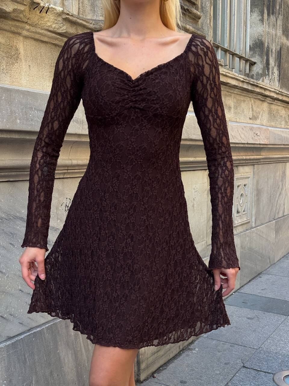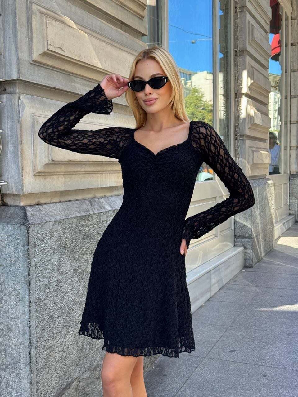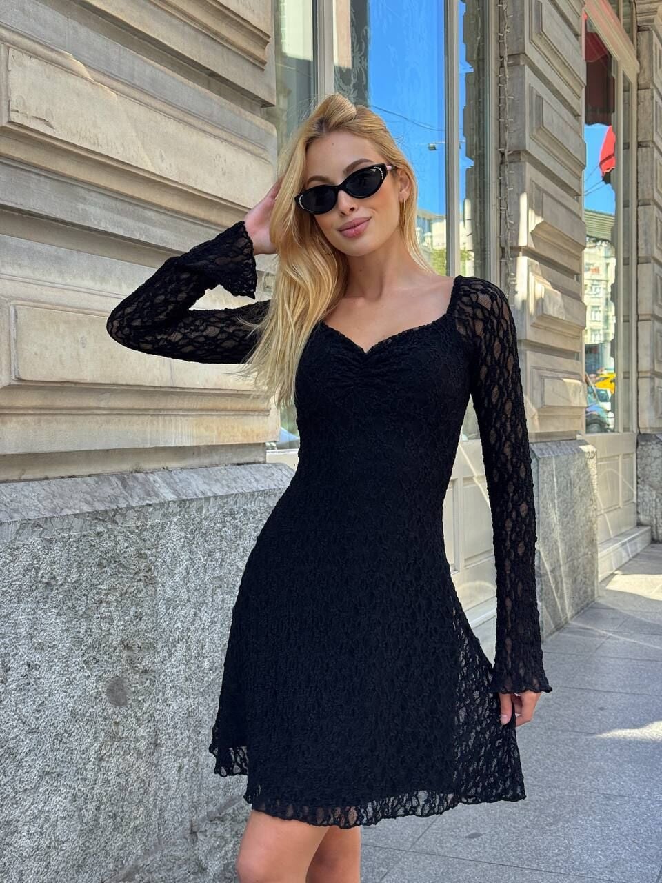 Bu elbise, gardırobunuzun en şık ve dikkat çekici parçası olmaya aday! ❤️ Romantizmi ve modernliği birleştiren tasarımı sayesinde girdiğiniz her ortamda tüm bakışları üzerinize çekeceksiniz.; Elbise, zarif bir duruş sunan ve omuzları nazikçe açıkta bırakan Kayık Yaka kesimine sahiptir.; Bu yaka tipi, boyun ve köprücük kemiği hattını vurgulayarak sofistike bir hava katarken, modelin en çarpıcı detayı olan Uzun Çan Kol kesimi, dinamik ve trend bir silüet oluşturur; kol hareketlerinizle birlikte akıcı bir görünüm sağlar.; Mini boyu ve beli vurgulayan A Kesim silueti, vücudu orantılı gösterir ve rahat bir hareket özgürlüğü sunar.; Elbisenin tamamında kullanılan yüksek kaliteli dantel kumaş, feminen ve özel bir doku katarken, içerisindeki astar sayesinde konfor ve güvenliği garanti eder.; Esnek yapısı sayesinde vücuda mükemmel uyum sağlar ve hareketlerinizi kısıtlamaz.; Materyal bileşeni olarak %95 Polyester ve %5 Elastan/Likra karışımından üretilmiştir, bu da hem dayanıklılığını hem de fit duruşunu destekler.; Bu eşsiz parçayı, özel davetler, şık kokteyller, mezuniyet törenleri veya romantik akşam yemekleri gibi tüm özel anlarınızda güvenle tercih edebilirsiniz.; Elbisenizin uzun ömürlü olması için lütfen bakım talimatlarına uyun: Hassas dantel yapısından dolayı elde veya makinede maksimum 30°C'de hassas programda yıkanması, ağartıcı kullanılmaması ve sererek kurutulması tavsiye edilir.; Düşük ısıda tersten ütüleme yapılabilir.; Bu parça ile tarzınızı en iddialı şekilde yansıtın!