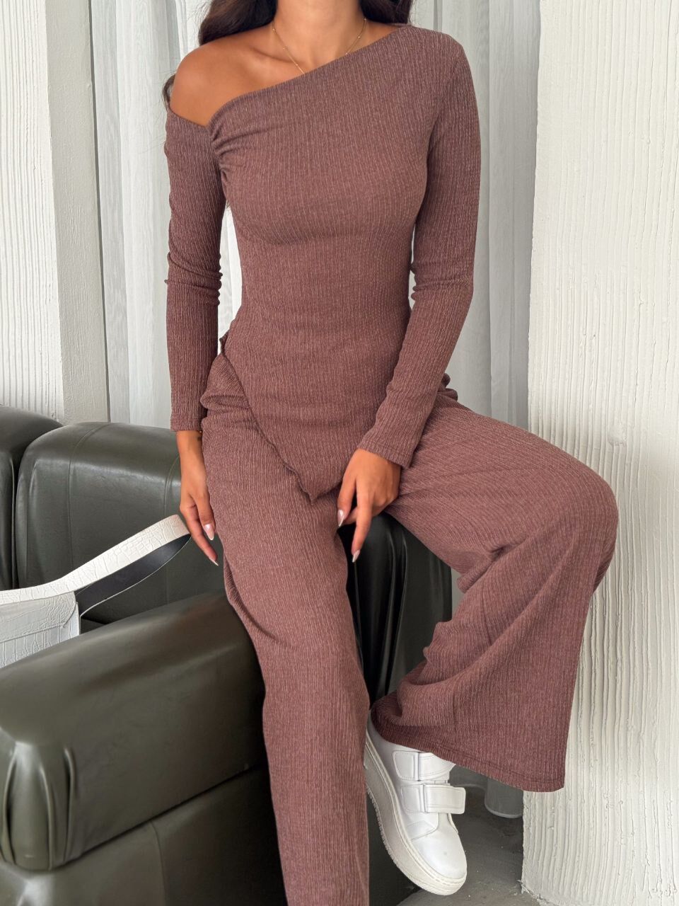 Kadın Düşük Omuz Drape Detay Bürümcük Bluz Pantolon Takımı