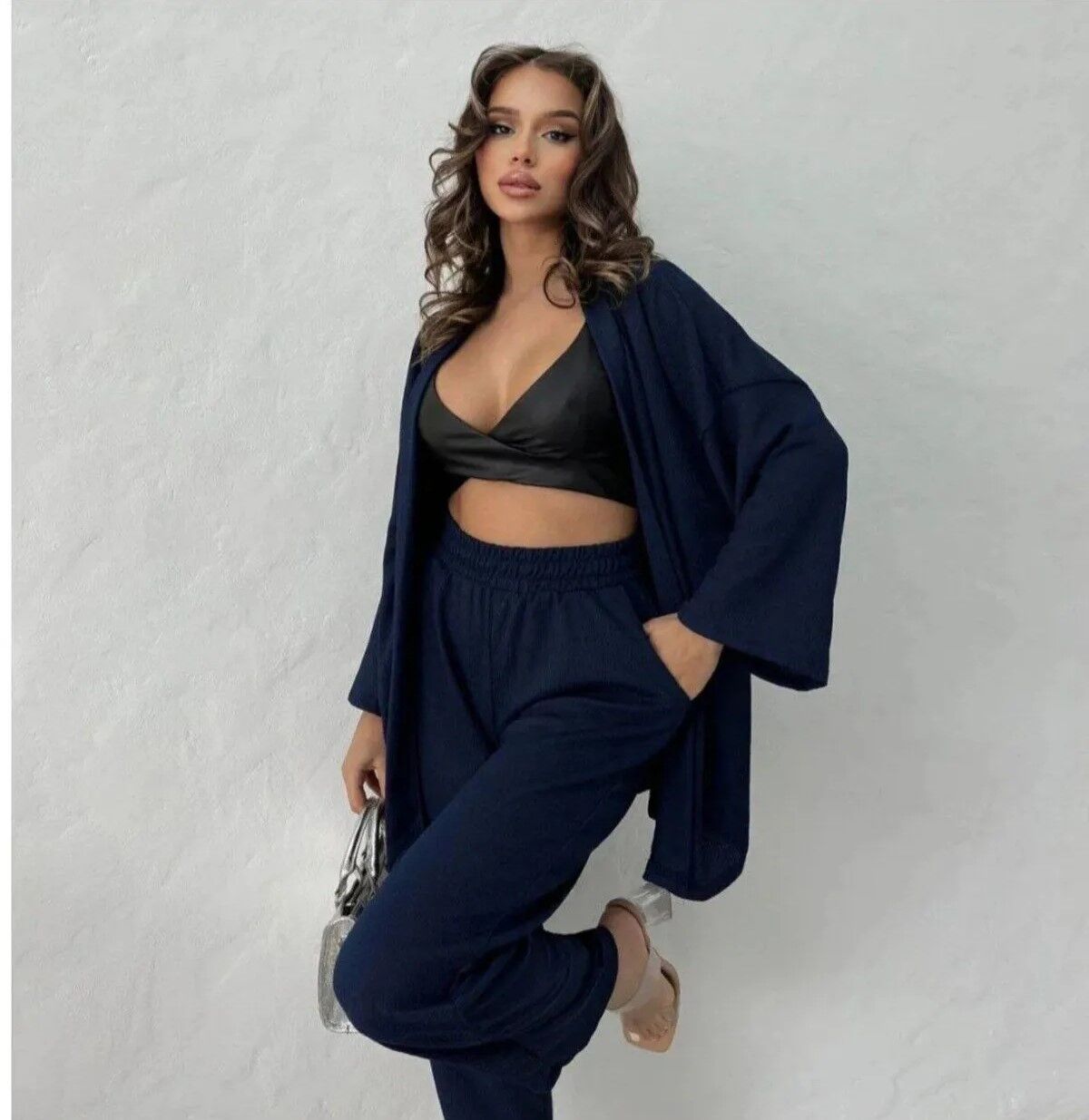 Modern ve rahat stilin buluştuğu Kadın Kimono Bürümcük Alt Üst Takım, günlük kullanım ve mevsim geçişleri için ideal bir tercihtir. Oversize kesimi ve yarasa kol tasarımı, hareket özgürlüğü ve şıklığı bir arada sunar. Lastikli bel ve paça detayları, rahat bir oturuş sağlarken minimalist tasarımı sayesinde her kombinle uyum gösterir.
