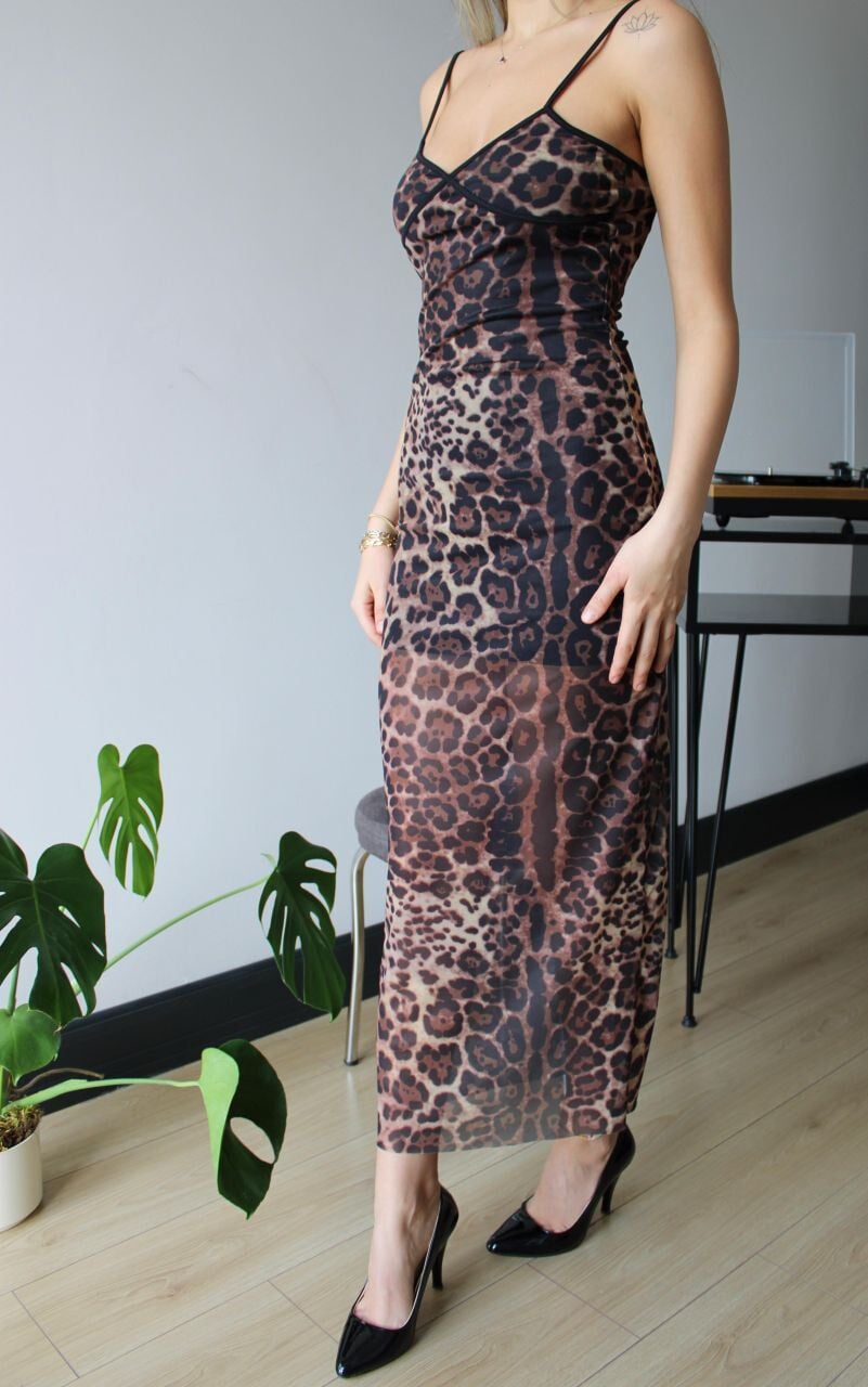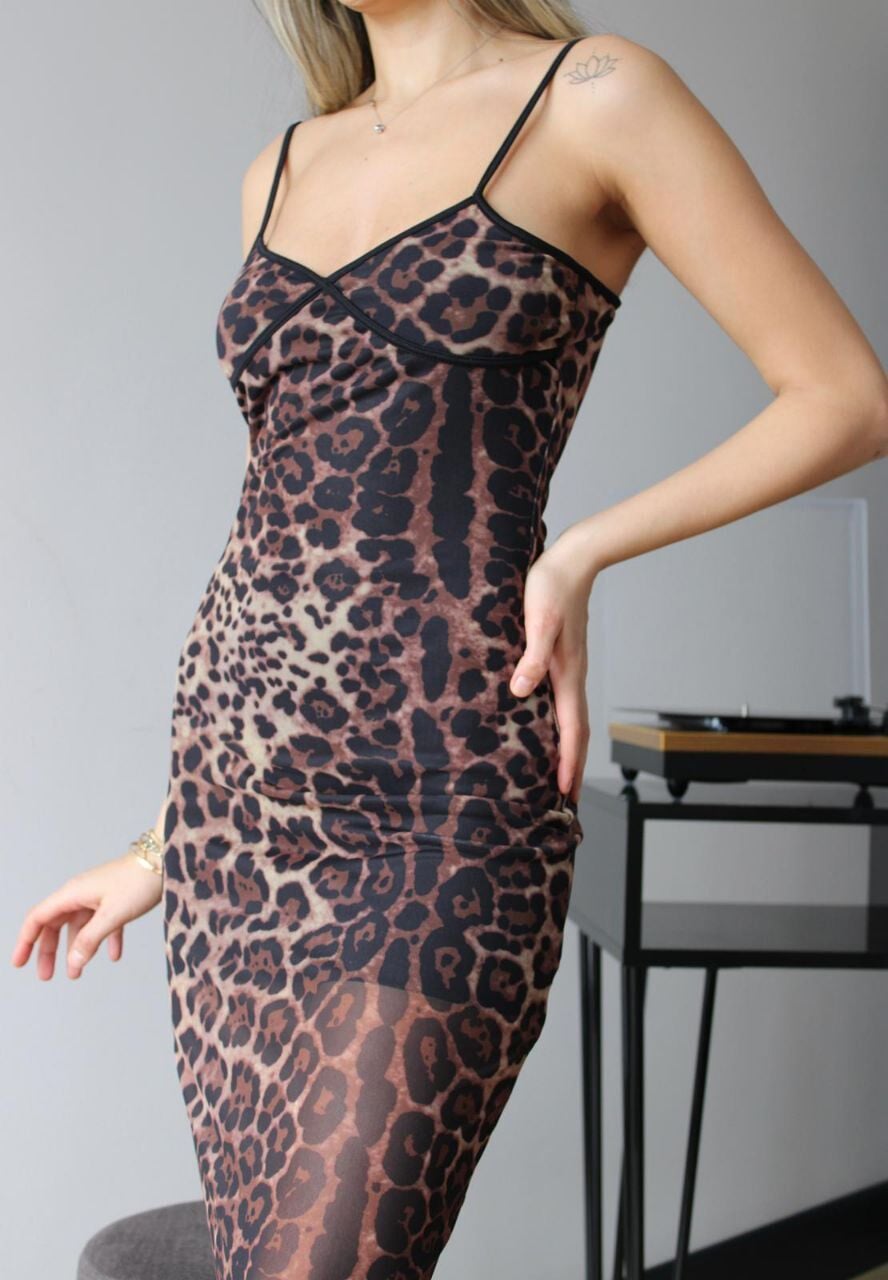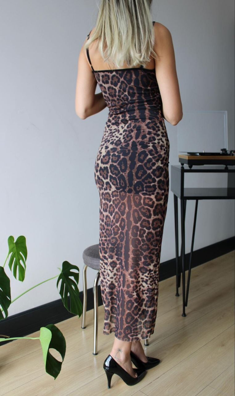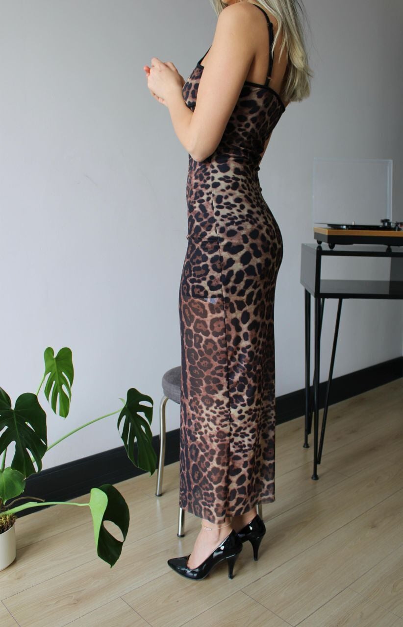 Kadın Leopar Desenli Askılı Tül Uzun Elbise,- Leopar desenli tül kumaştan üretilmiş, göz alıcı bir görünüm sunar.; - V yaka tasarımı ile feminen bir siluet oluştururken, askılı kol yapısı yaz aylarında serinlik sağlar.; - Uzun boyu ve slim kalıbı sayesinde zarif bir duruş sergiler.; Kadın Leopar Desenli Askılı Tül Uzun Elbise- İç göstermeyen tül dokusu ile rahatlıkla tercih edilebilir.; - Astarlı yapısı, konforlu bir kullanım sunar ve vücut hatlarını nazikçe sarar.; - Şık ve gece ortamları için ideal olan bu elbise, dijital baskı tekniğiyle canlı renkler taşır.; - Elde yıkama önerisiyle uzun ömürlü kullanım imkanı sağlar.; - Kemersiz tasarımı, elbisenin doğal akışını ön plana çıkarır.; -Kadın Leopar Desenli Askılı Tül Uzun Elbise,Young koleksiyonuna ait olan bu parça, genç ve dinamik tarzınızı yansıtmanız için mükemmeldir.
