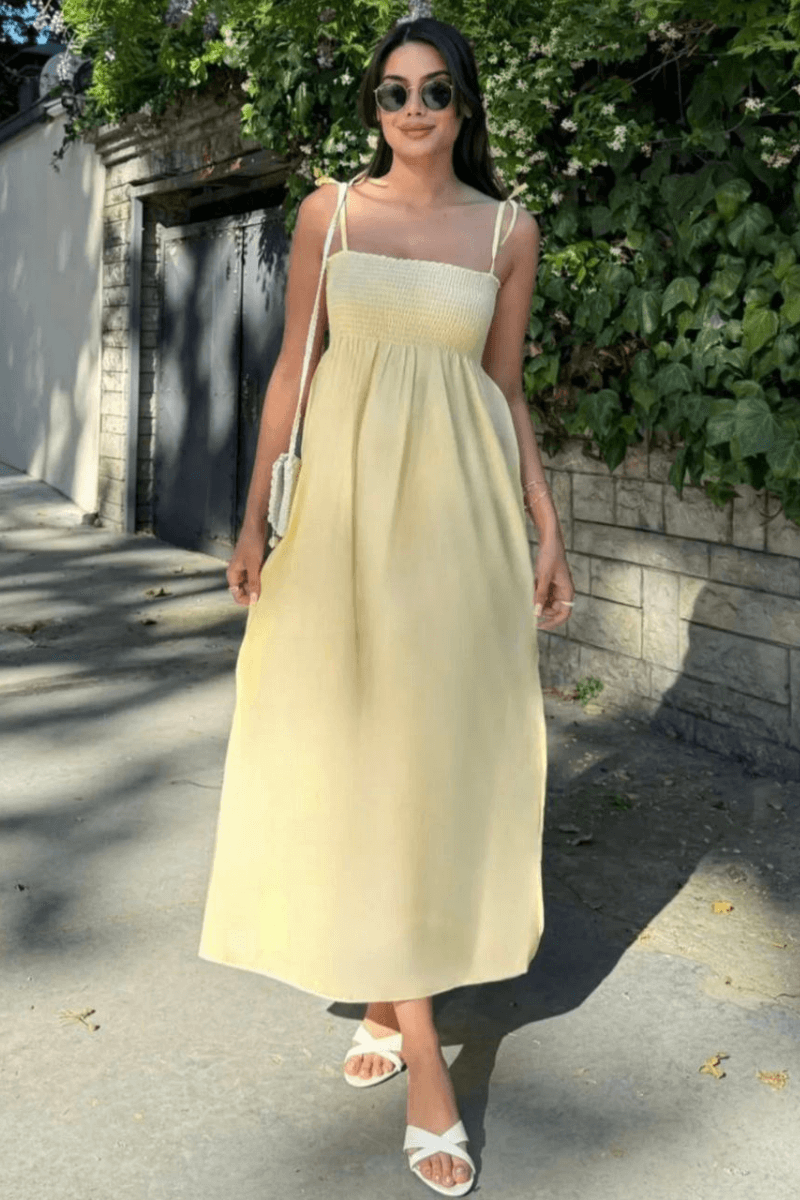 Konfor ve şıklığı bir arada sunan Kadın Poplin Askılı Elbise, %70 viskoz ve %30 keten karışımı kumaşı ile hem hafif hem dayanıklı bir kullanım sağlar. Poplin dokuma tipi, düz deseni ve kapamasız tasarımıyla modern ve minimalist bir stil sunarken, askılı kol tipi ve U yaka kesimi feminen detayları ön plana çıkarır. Maxi boyu ve regular kalıbı, vücut hatlarını saran ancak sıkmayan bir siluet oluşturarak her yaş grubuna uygun bir kullanım deneyimi sunar.